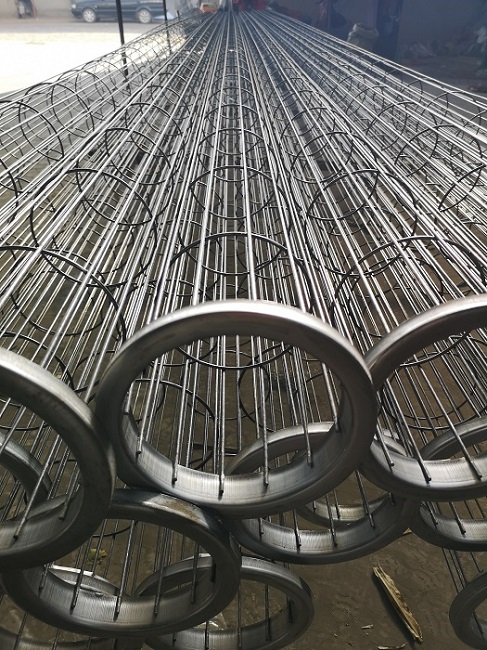 .袋籠籠骨采用20號鋼冷拔絲制作,直徑≥φ4mm,上端口須有防止脈沖氣流(壓縮空氣)直接沖刷濾袋口的有效保護結(jié)構(gòu)(保護套長度不小于300mm);袋籠應堅固,袋籠的縱筋和反撐環(huán)繞筋線分布均勻,豎筋數(shù)量不小于16根,豎筋之間間距不大于30mm,反撐環(huán)繞筋線間隔不大于250mm,垂直度滿足規(guī)范要求。