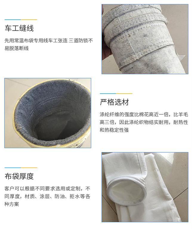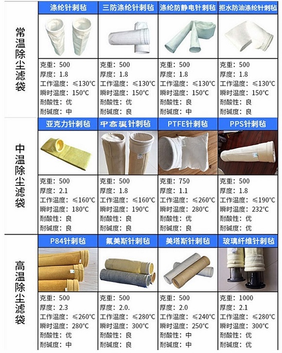 除塵布袋的材質是按照使用工況的溫度來進行分類,有高溫布袋、中溫布袋及常溫布袋;高溫布袋材質有P84針刺氈、氟美斯、美塔斯、玻纖針刺氈等;中溫布袋材質有PPS針刺氈、PTFE針刺氈、芳斯特針刺氈、亞克力針刺氈等;常溫布袋材質有滌綸針刺氈、覆膜滌綸針刺氈、拒水防油針刺氈、拒水防油芳靜電針刺氈等;根據使用工況選用各種材質濾料。