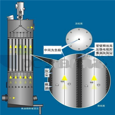 高壓直流電源產生的負高壓,接入電暈極(陰極),它與沉淀極(陽極)之間產生電場,電場強度抄過一頂及限后在陰陽兩極間即產生電暈放電。此時流經電場區的氣體發生電離,產生大量的離子和電子。周圍可聽見強烈的電磁風聲并可見紫蘭色電暈。通過電場的煤氣中的焦油、粉塵、水霧等粒子與離子或電子結合而荷電,在電場力的作用下向兩極運動。由于電子質量小,運動速度快,空間分布廣,所以主要是荷負電的粒子向沉淀極運動。到達沉淀極板中和后,依靠殘存的靜電引力和分子間凝聚力首先吸附于沉淀極,而后靠自身重力沿極板下落,通過焦油出口排出。